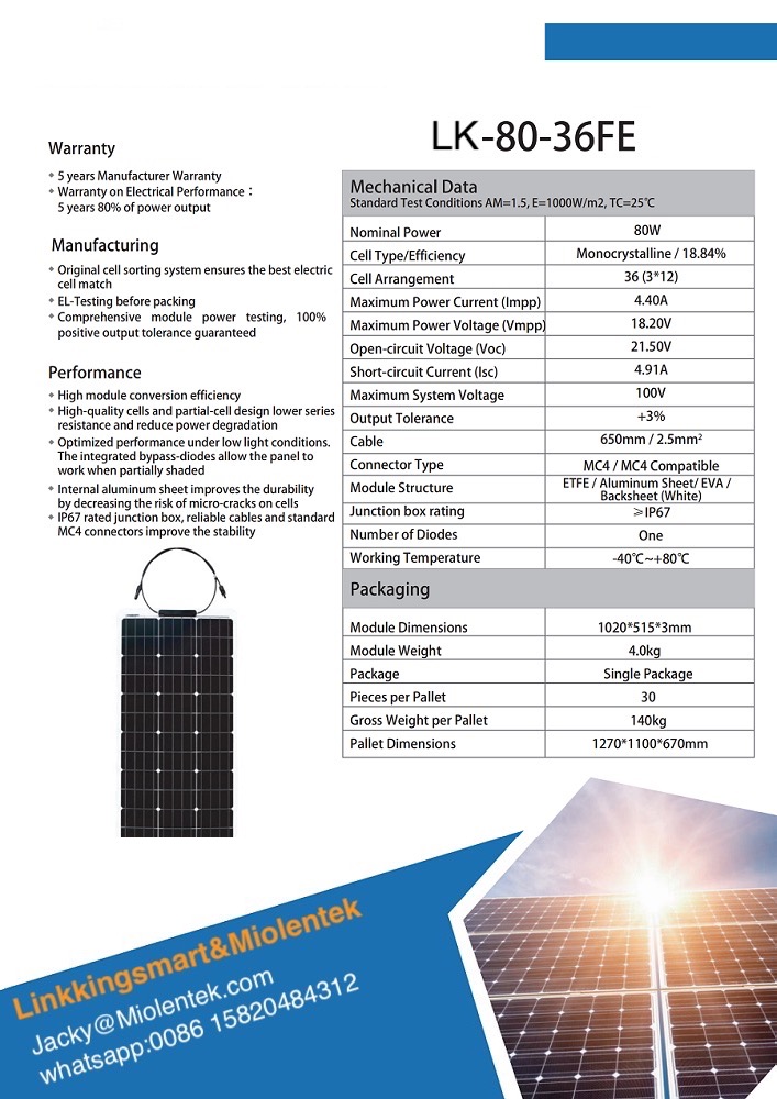 Semi flexible 1020x515mm ETFE 18V 80W ETFE Semi Flexible solar panel